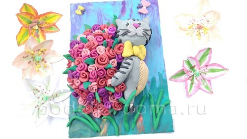 • Аппликация из пластилина «Котик с букетом»
